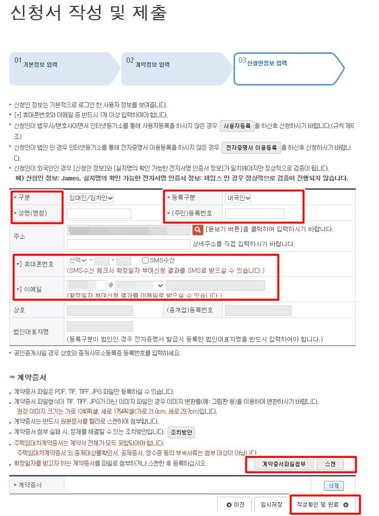 7. 신청인정보의 성명과 주민번호, 핸드폰번호, 이메일의 내용이 정확히 기입되었는지 확인합니다.