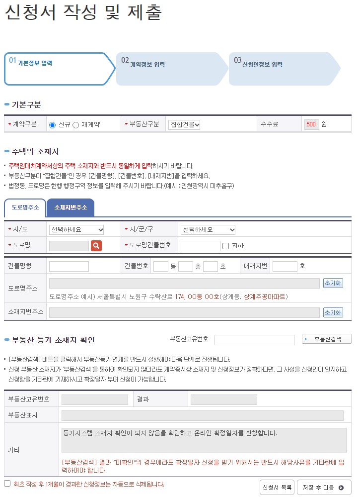 6. 기본정보에는 주소지(전세계약주소)를 넣고 계약정보에는 보증금과 임대차 기간, 임대인 임차인 정보 등을 입력합니다.
